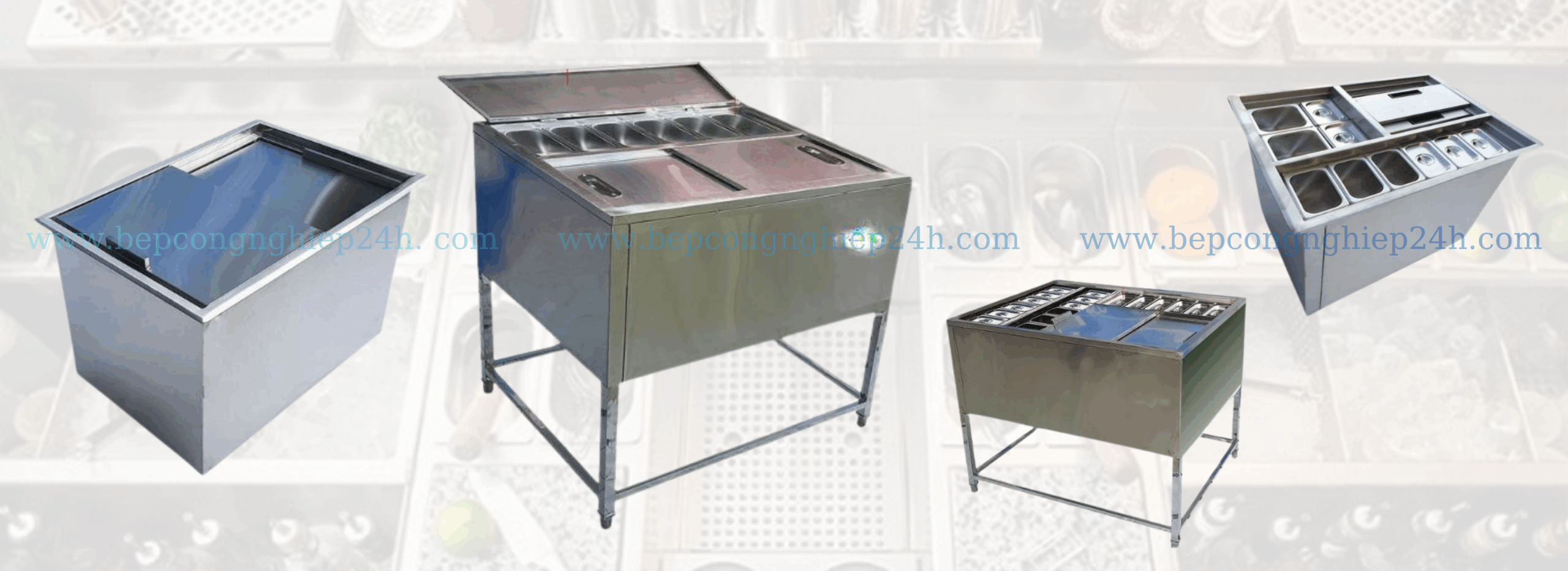 Quầy pha chế này có thêm thùng đá để giữ lạnh đồ uống và nguyên liệu. Thùng đá thường được thiết kế 2 lớp, có lỗ thoát nước để đảm bảo vệ sinh và giữ đá lâu tan. Quầy pha chế inox tích hợp thùng đá phù hợp với các quán chuyên phục vụ đồ uống lạnh.