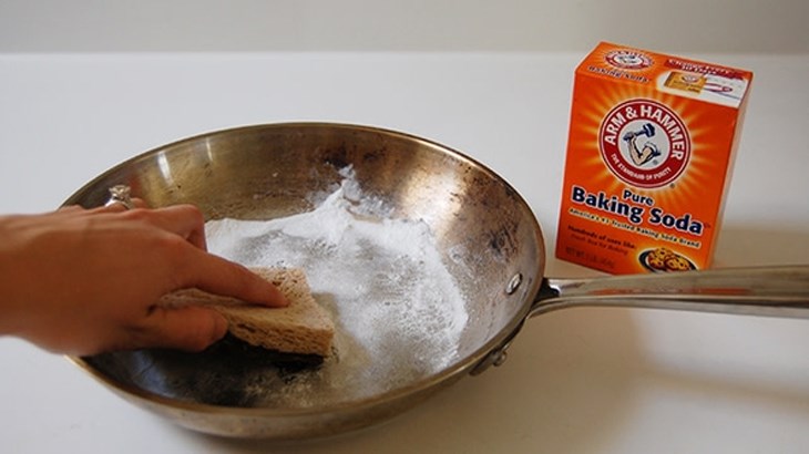 - Rắc một lớp baking soda đều lên bề mặt inox bị ố vàng.