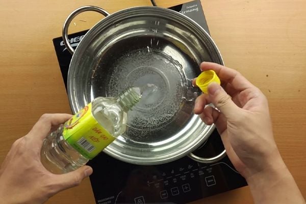 - Đặt nồi lên bếp và đun nóng hỗn hợp giấm và nước.